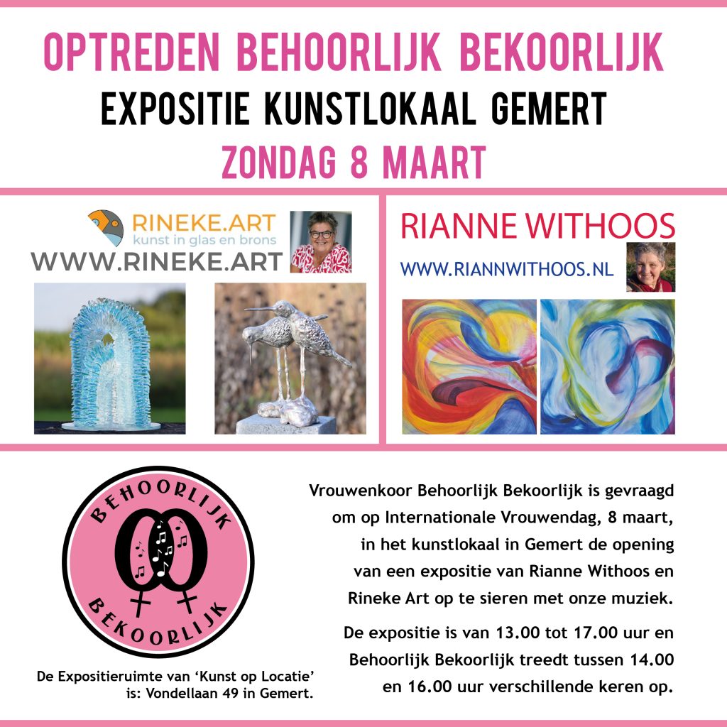 Vrouwenkoor Behoorlijk Bekoorlijk is gevraagd om op Internationale Vrouwendag, 8 maart, in het kunstlokaal in Gemert de opening van een expositie van o.a. Riann Withoos op te sieren met onze muziek.